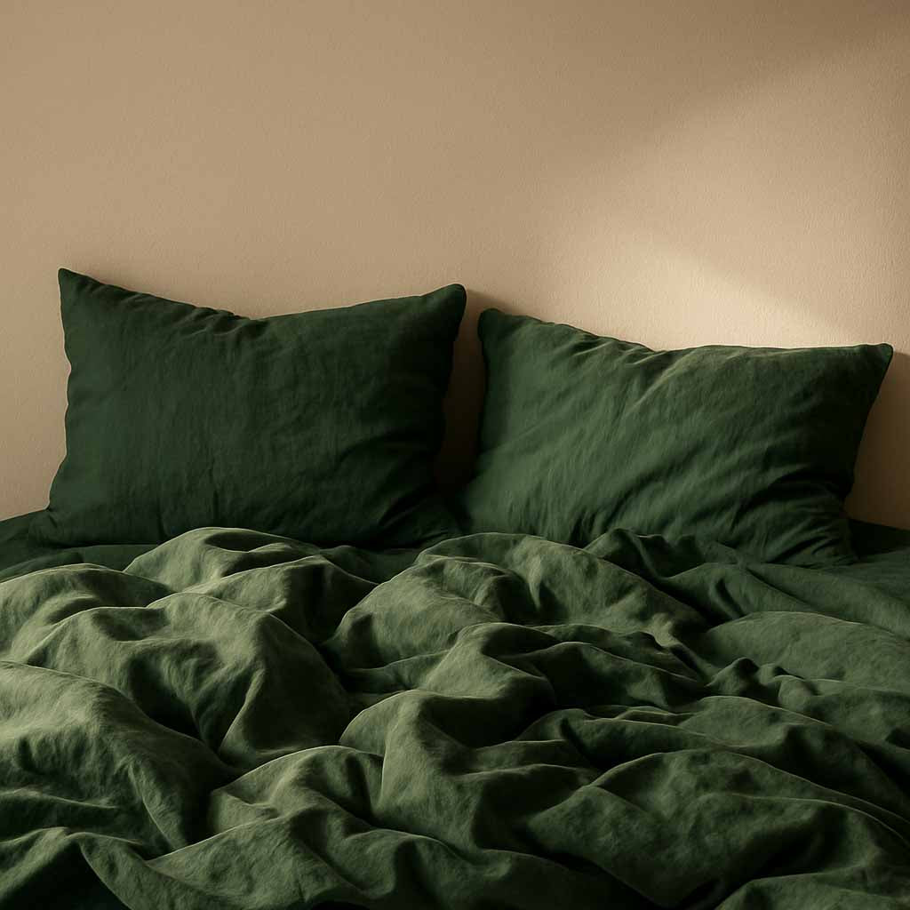 Du suchst nach einem natürlichen Look mit einer Extraportion Ruhe? Dann ist unsere Halbleinen-Bettwäsche in Waldgrün genau das Richtige für dich!